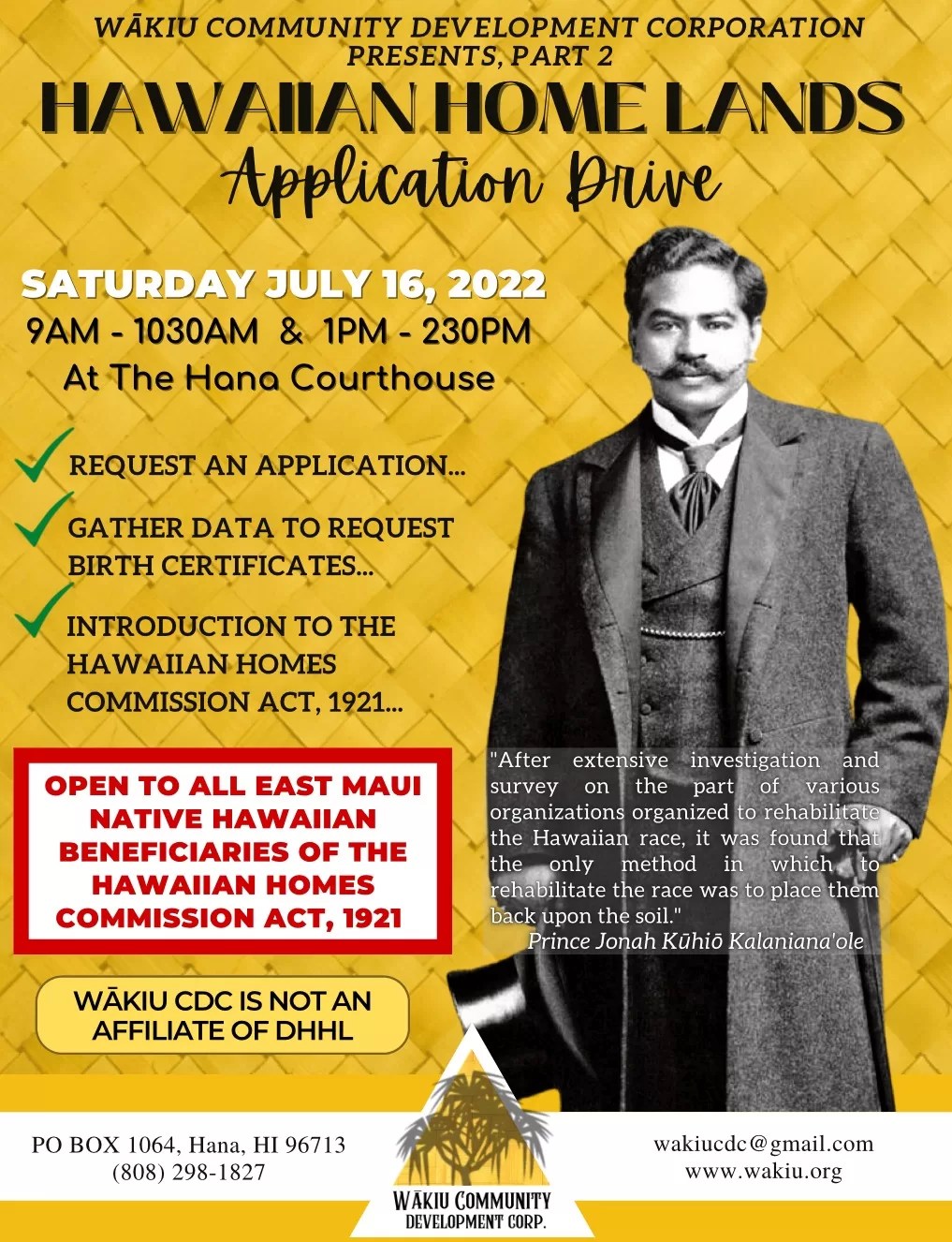 Currently, in East Maui, there are 647 acres of Hawaiian Homelands located in the ahupua’a of Wākiu, Moku of Hana, since 1995. It was exchanged lands through the Department of Land and Natural Resources (DLNR). In 2004, the Maui Island Plan https://dhhl.hawaii.gov/wp-content/uploads/2012/05/Island_Plan_Maui_2004.pdf was developed to acknowledge Wākiu for land use. Later in 2012, there was infrastructure planned for 80 homes in Wākiu but it never happened.